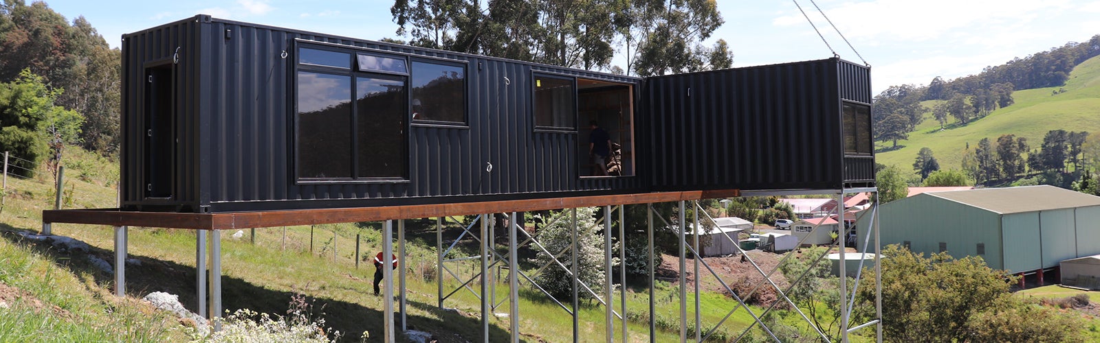 It’s not uncommon to find shipping containers taking on new uses once they’ve finished travelling the high seas. But it’s not every day you’ll find two containers welded together and placed on a structural steel support frame to form a house with views over a lush Tasmanian valley.